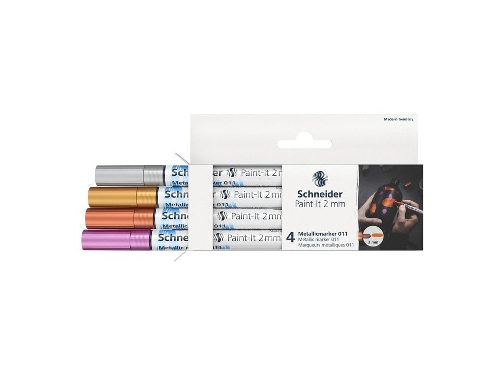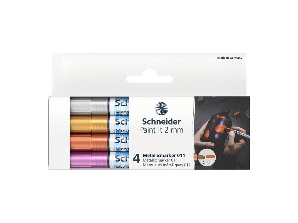 akrylový popisovač s kovovým leskom pre dosiahnutie maximálneho efektu hrúbka písma: 2 mm nová pigmentová technológia pre čisté a homogénne farby na rôzne povrchy, najlepší efekt dosiahne na tmavom povrchu rýchloschnúci atrament s ventilom sada obsahuje: 4 rôzne farbyDodatočné parametre