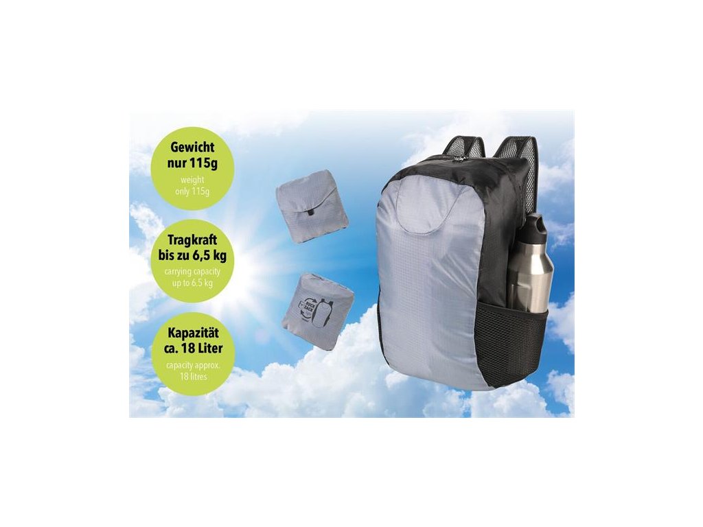 Či už pri plánovanom alebo spontánnom nákupe, tento skladací batoh je skvelou voľbou vďaka svojej úspornosti. -hmotnosť: iba 115 g -veľký hlavný priečinok na zips -vnútorné vrecko so suchým zipsom -2 bočné vrecká na fľašu a dáždnik -nastaviteľné ramenné popruhy -objem: približne 18 litrov -nosnosť: približne 6,5 kg -materiál: 100 % polyester -priestorovo úsporný dizajnZnačka: TROIKA