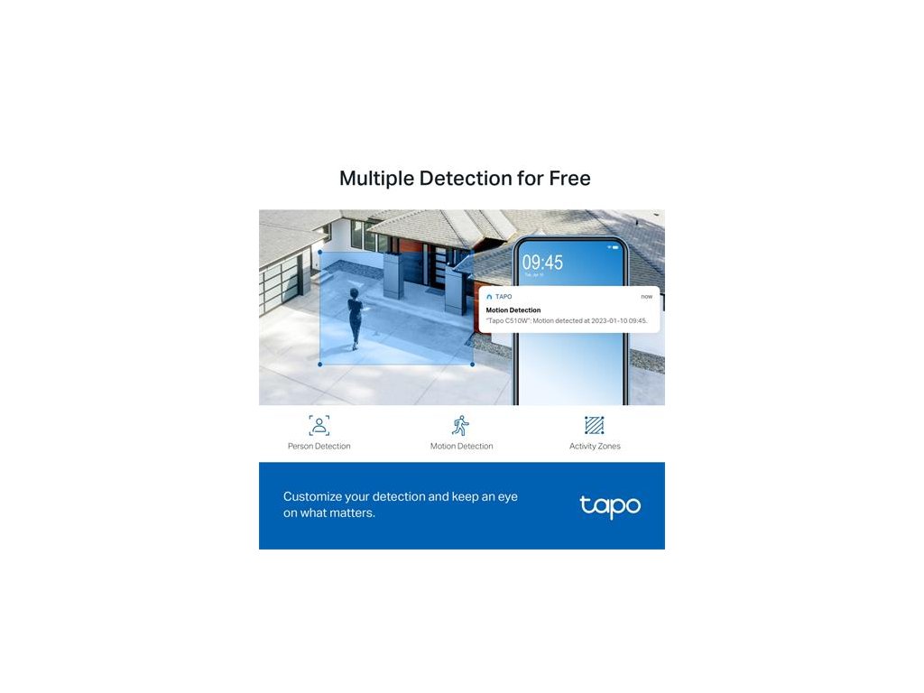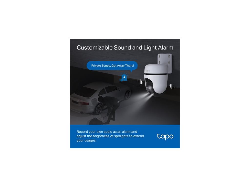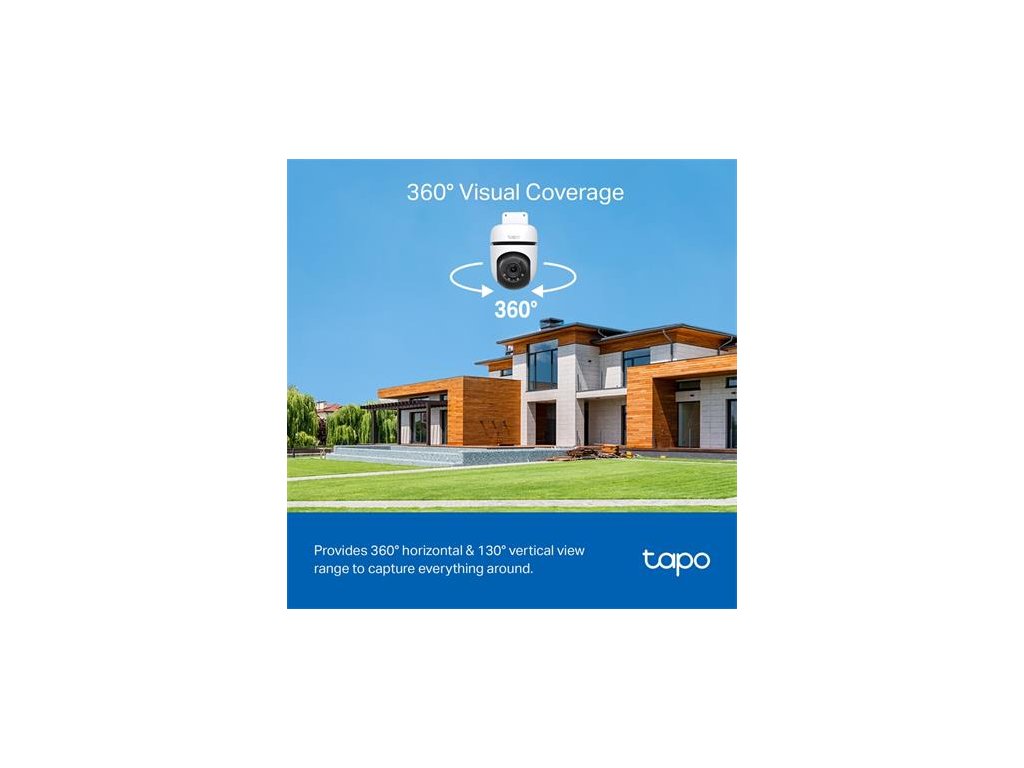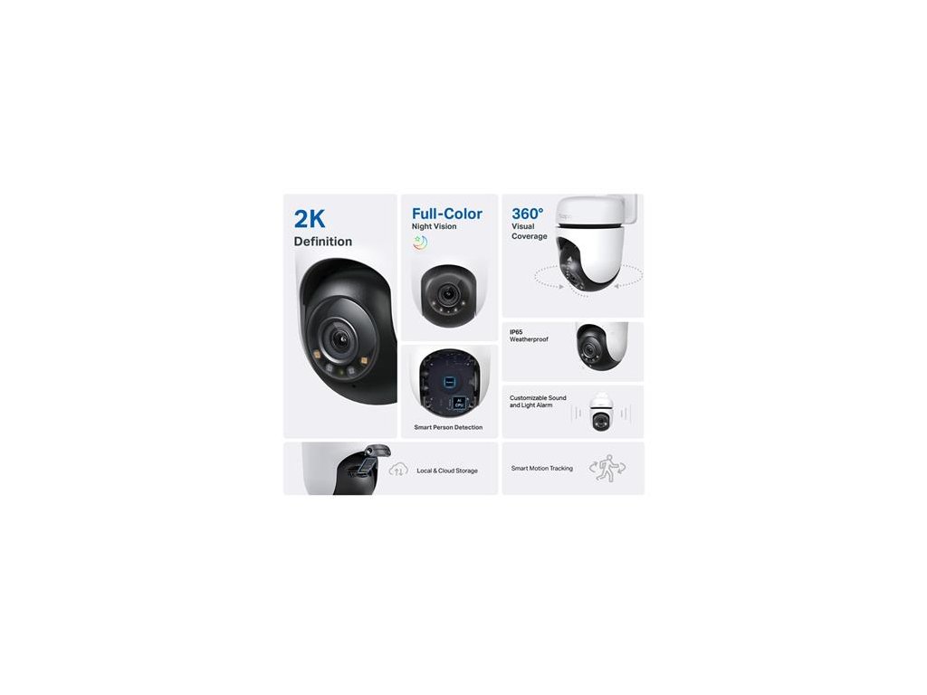 Vonkajšia bezpečnostná kamera - 2K rozlíšenie: s rozlíšením 2304 × 1296 px získame oveľa ostrejší obraz v porovnaní s tradičným full HD rozlíšením. - plnofarebný obraz aj v noci so vstavanými reflektormi -360° horizontálne a 130° vertikálne pozorovacie uhly -inteligentné sledovanie pohybu: sleduje pohyb s vysokou rýchlosťou otáčania, vďaka čomu môžete sledovať kritické udalosti -inteligentná AI identifikuje ľudí, upozorní vás v prípade potreby – môžete tiež nastaviť prispôsobiteľné zóny aktivity alebo hranice, aby ste dostávali iba dôležité upozornenia – prispôsobiteľný zvukový a svetelný alarm: nahrajte si vlastný zvuk ako budík a upravte jas podľa potreby – miestne a cloudové úložisko: uložte zaznamenané videá na microSD kartu (až 512 GB) alebo pomocou cloudových služieb Tapo Care** odolný voči poveternostným vplyvom: vynikajúce vodotesné a prachotesné (IP65) vlastnostiDodatočné parametre