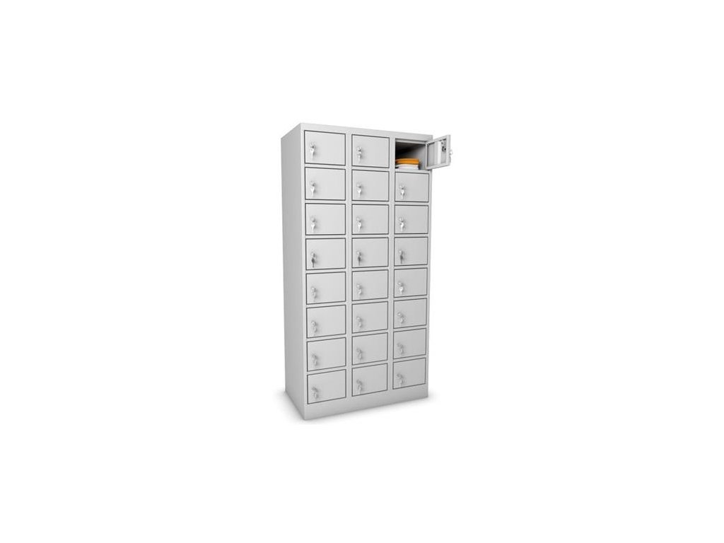 Séria „TRM”: kvalitná uzamykateľná skrinka na cennosti z oceľového plechu s 24 priehradkami, vyhotovenie so súvislým podstavcom.- materiál: kovový oceľový plech