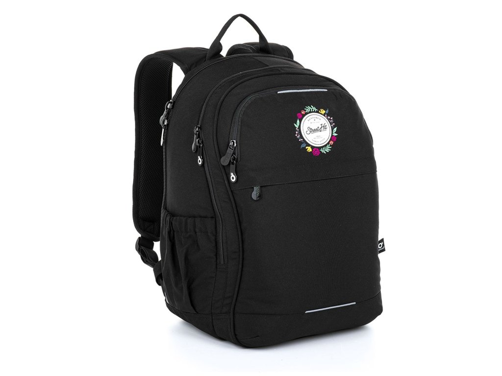 Dvojkomorový batoh v temne čiernej farbe oživený vyšívanými kvetmi a štýlovou nášivkou. Chrbát batohu je polstrovaný a anatomicky tvarovaný z mäkkej peny. Vnútri zadnej komory je umiestnené polstrované vrecko na notebook aj tablet.