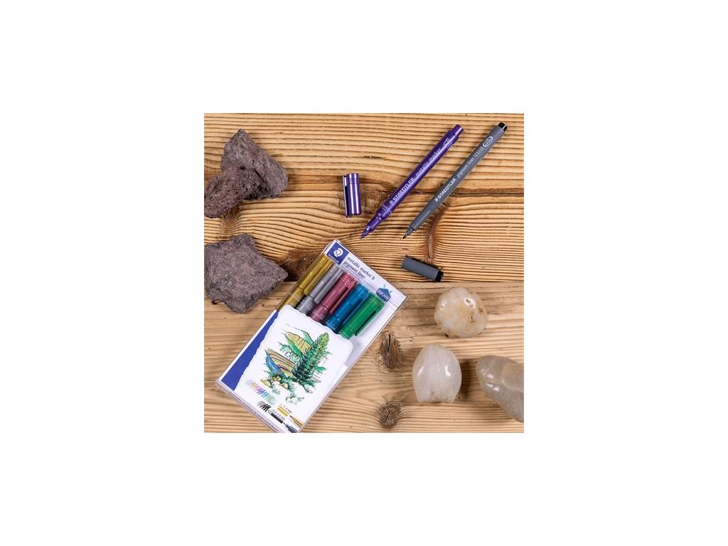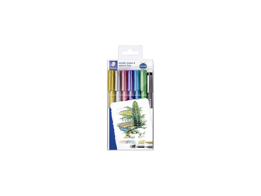 Dekoračný popisovač, 1-2 mm, kužeľový hrot, STAEDTLER "8323", 6 rôznych kovových farieb, darček: čierne tušové pero