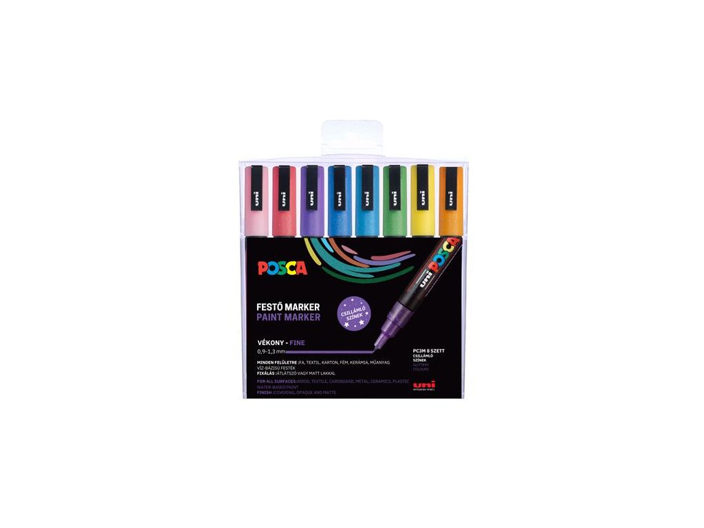 Dekoračný popisovač, sada, 0,9-1,3 mm, UNI "Posca PC-3ML", 8 rôznych trblietavých farieb
