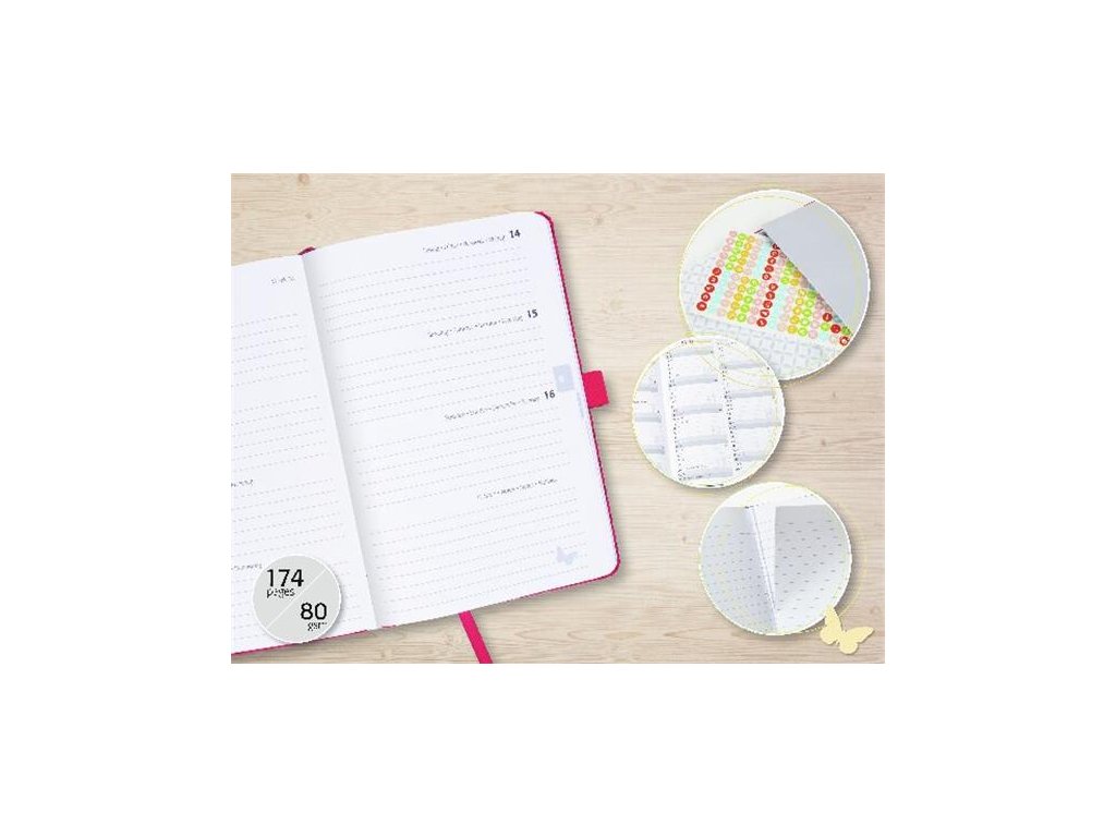 -týždenné rozvrhnutie (2 strany = 1 týždeň) -mesačný a ročný plánovač na roky 2026/2027 -s plánovačom narodenín a darčekov -s mapou sveta -so zoznamom úloh -s nálepkami "ikonky"