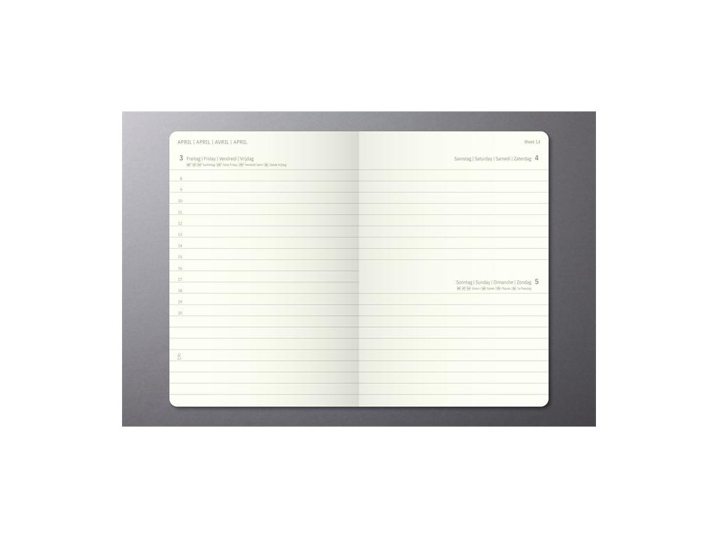 -denné rozvrhnutie (1 strana = 1 deň; sobota/nedeľa spolu na jednej strane) -mesačný a ročný plánovač na roky 2026/2027 -gumička na uzatváranie -držiak na pero na bočnej strane -vnútorné rohové vrecko a archivačné púzdro -s označovacou páskou -s mapou sveta - s tabuľkou veľkostí - papier chamois, 80 g/m² -v zadnej časti perforované listy na poznámky -s nálepkami -rozmery: 108x151x30 mm -jazyk: DE/ENG/FR/NL