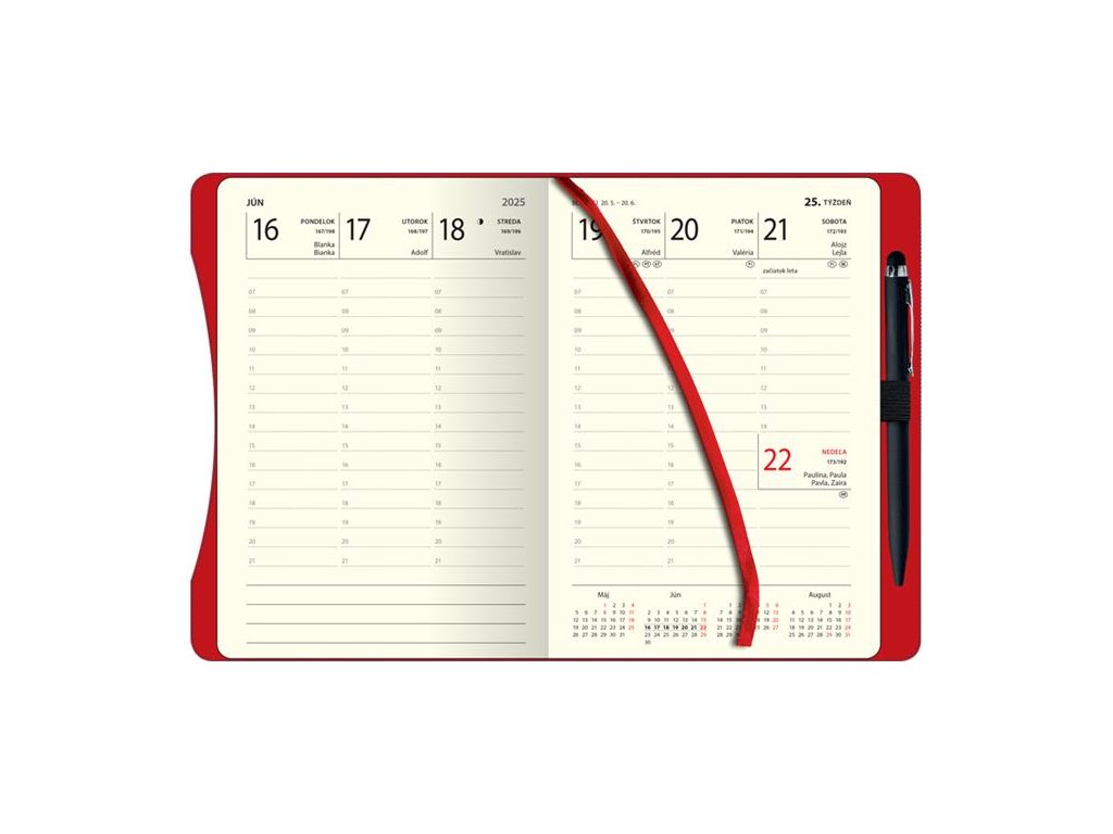Týždenná agenda s perom. Diár s tvrdou pogumovanou obálkou, s releifovým označením príslušného roka. Súčasťou je slovenský kalendár. Rozmer 138x205 mm, 192 strán.Dodatočné parametre