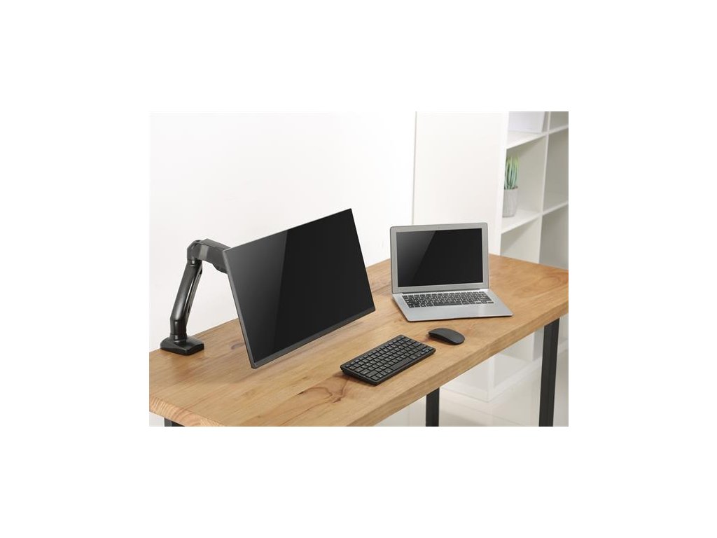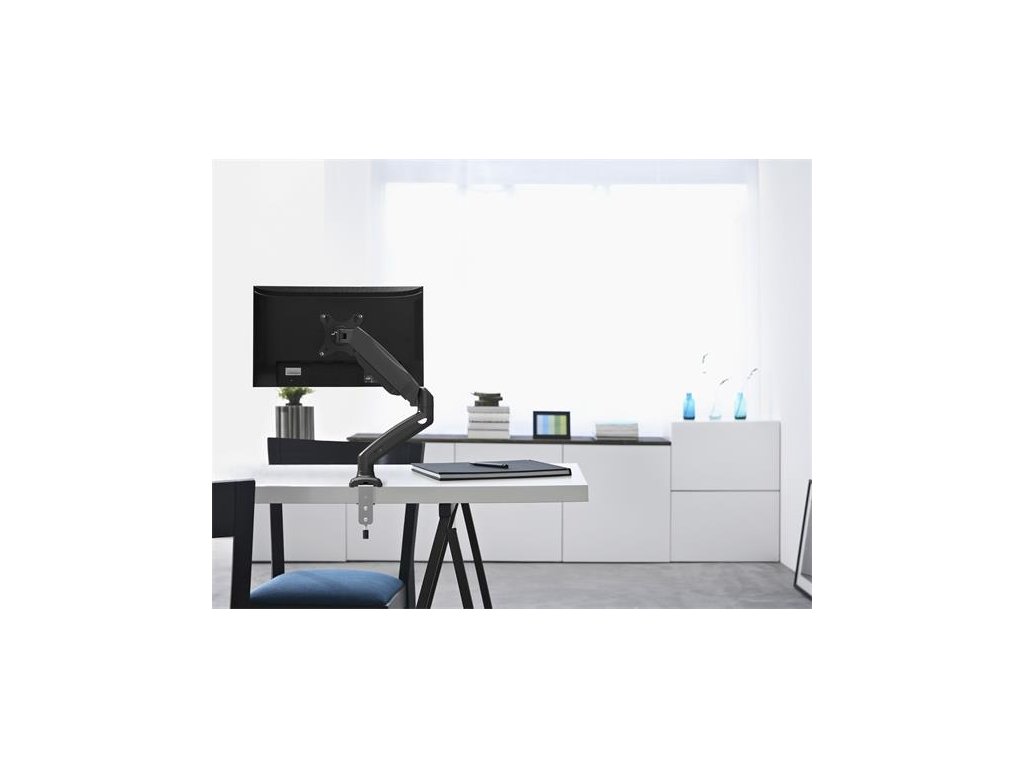 Silný a spoľahlivý držiak na stolný monitor - maximálna nosnosť: 6,5 kg - materiál: oceľ - montáž na stôl - dá sa otáčať o 360 ° - výškovo nastaviteľný - vstavané vedenie káblov - štandard VESA: 75 x 75; 100 x 100Dodatočné parametre