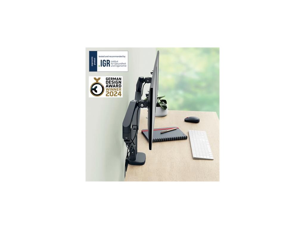 - Jednoduchá inštalácia pomocou priloženej rýchloupínacej odnímateľnej dosky Vesa® (75 a 100 mm) a silikónovej pogumovanej c-skrutky, ktorá znižuje vibrácie a chráni povrch stola, alebo pomocou priechodky v stole (rozsah hrúbky stola: 10–80 mm). Náradie na montáž a nastavenie je súčasťou balenia