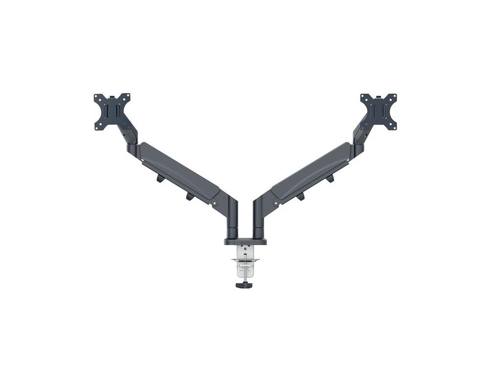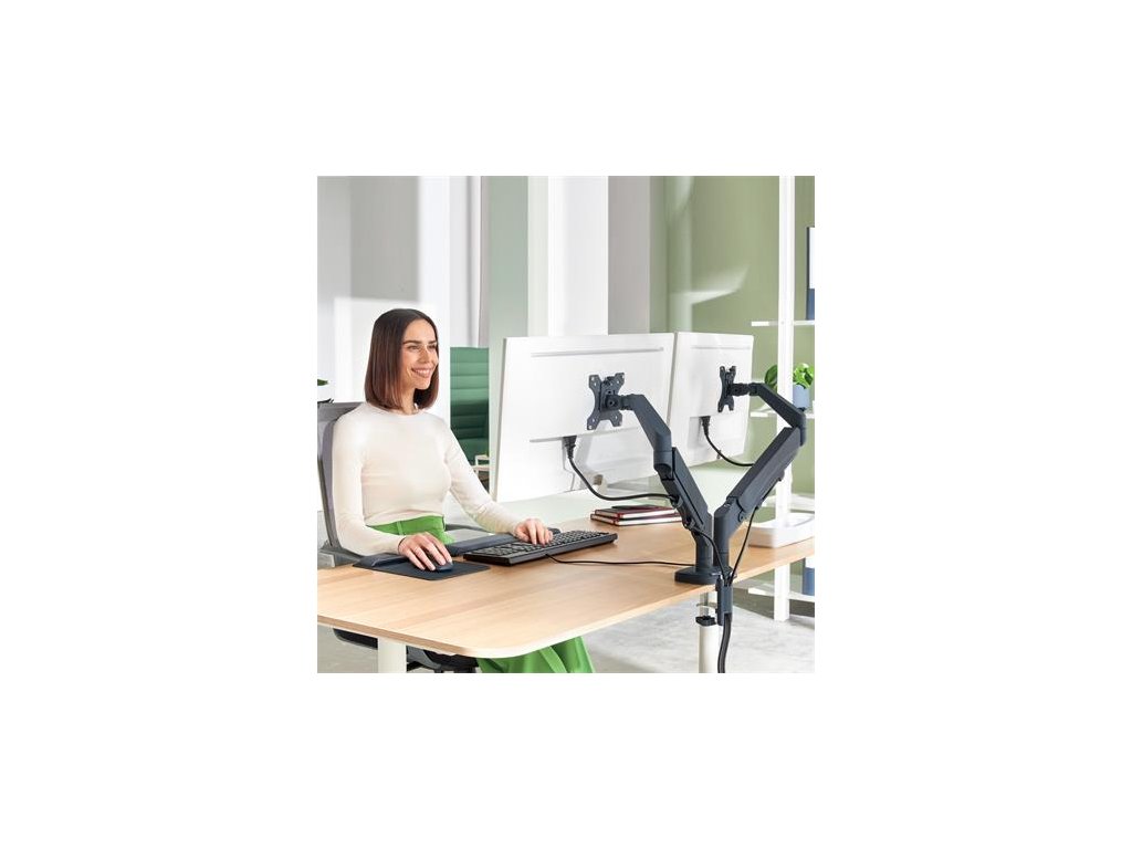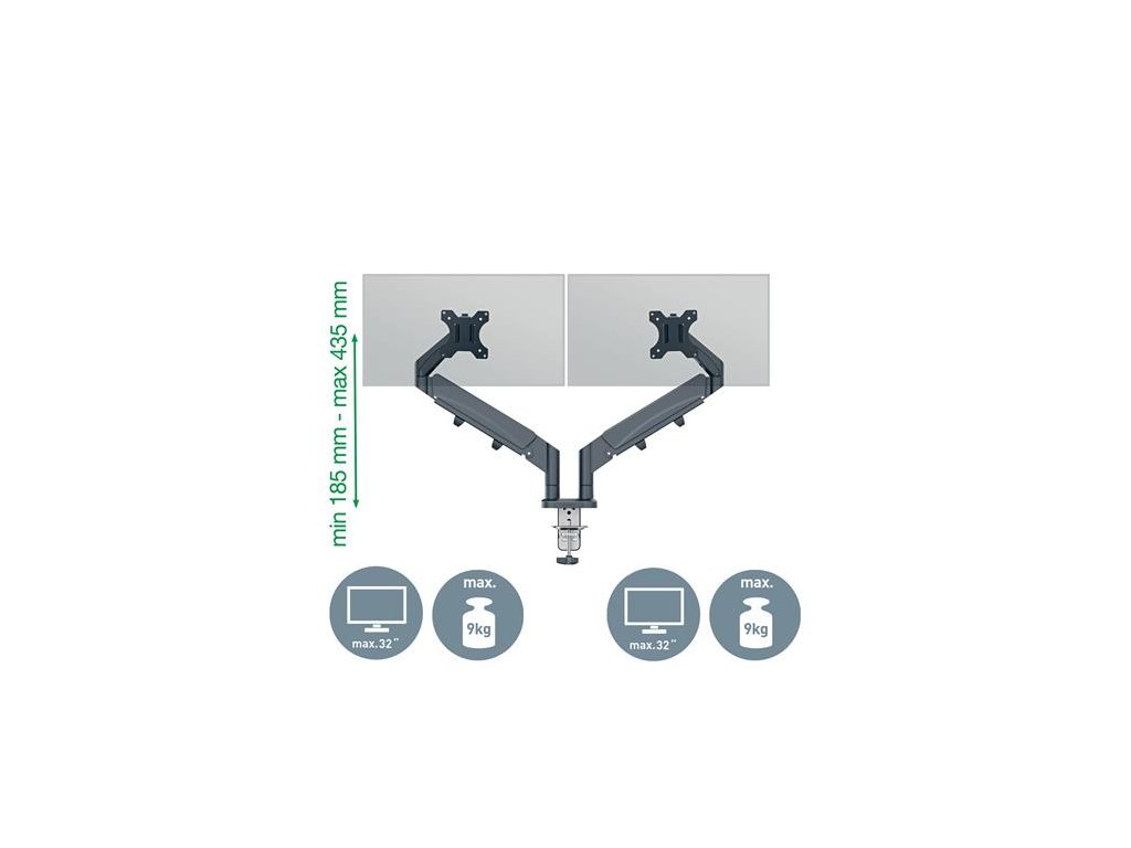 - Pevná a stabilná konštrukcia pre dva ploché alebo zakrivené monitory s uhlopriečkou 17–32", každý s hmotnosťou do 9 kg