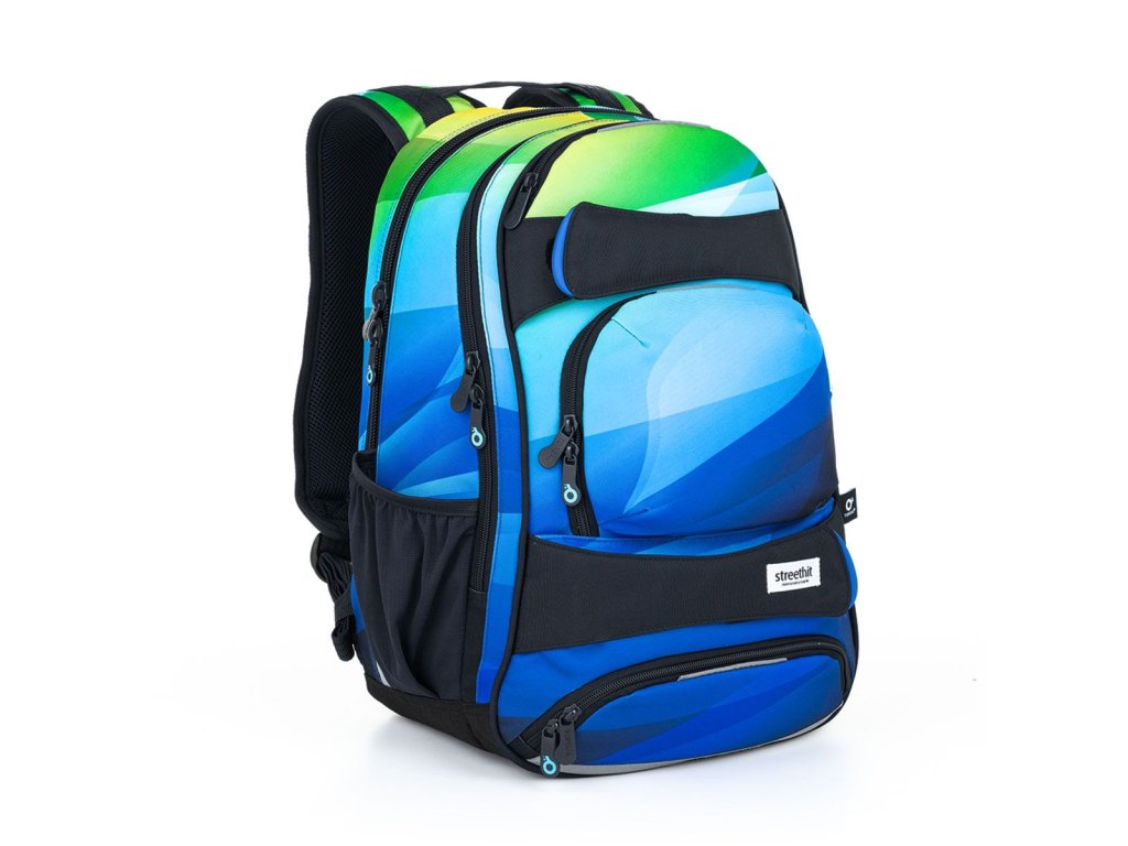 YUMI, stálice medzi študentskými strihmi tento rok v modro zelených farbách na tmavo modrom základe. Batoh odporúčame od druhého stupňa ZŠ, alebo od 150 cm výšky.