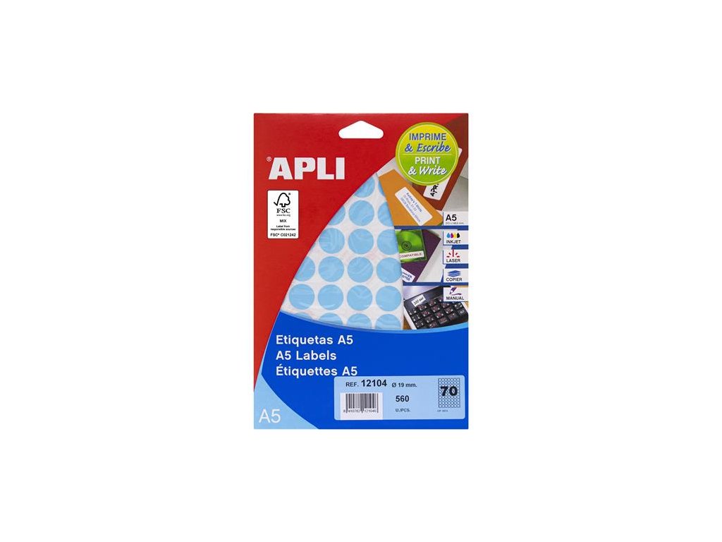Etikety, okrúhle, priemer: 19 mm, farebné, na liste formátu A5, APLI, modré, 560 etikiet/bal