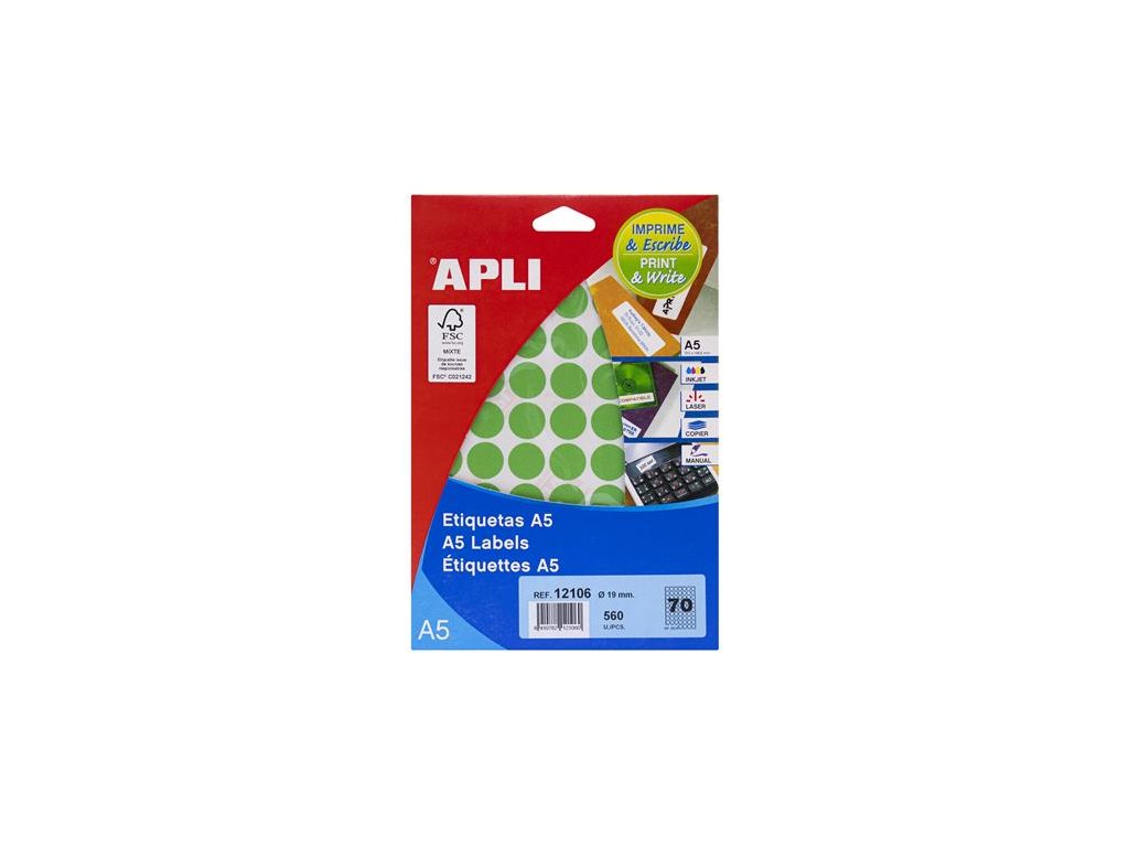 Etikety, okrúhle, priemer: 19 mm, farebné, na liste formátu A5, APLI, zelené, 560 etikiet/bal