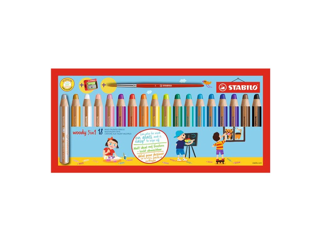 Farebné ceruzky, okrúhle, hrubé, STABILO "Woody 3 in 1", 18 rôznych farieb