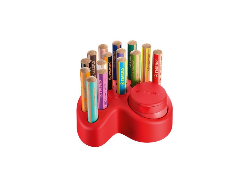 Farebné ceruzky, sada v stolnom držiaku, okrúhle, hrubé, STABILO "Woody 3 in 1", 15 rôznych farieb, so strúhadlom