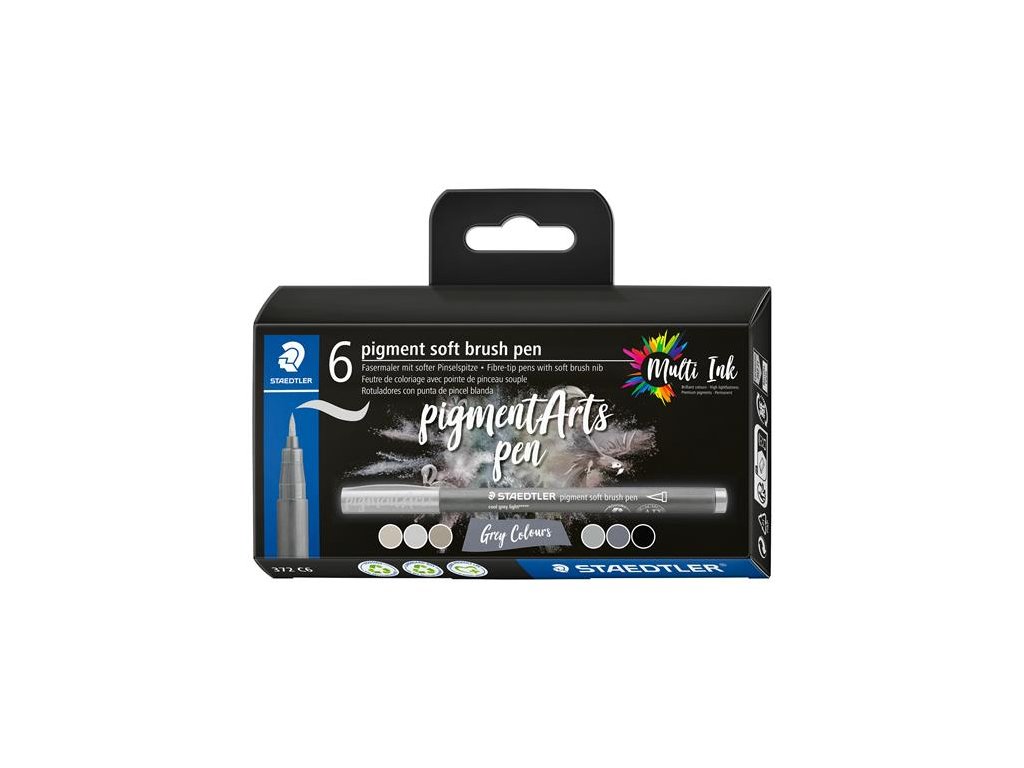 Fixka v tvare štetca, sada, STAEDTLER "Pigment 372", 6 rôznych odtieňov čiernej a sivej