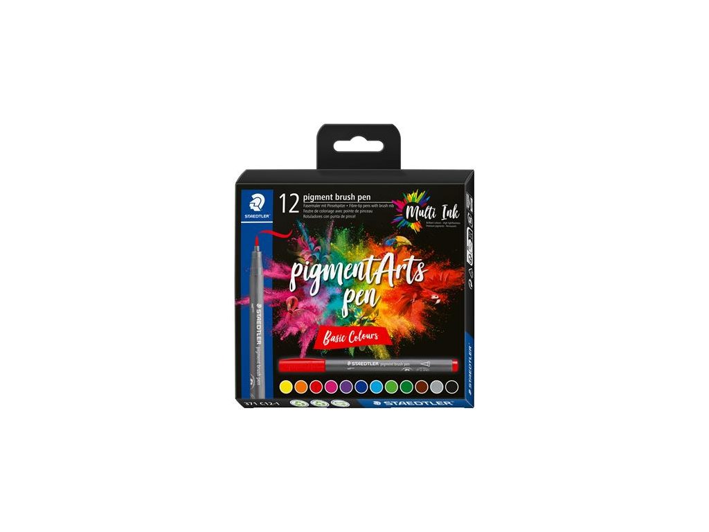Fixka v tvare štetca, sada, STAEDTLER "Pigment brush 371", 12 rôznych základných farieb