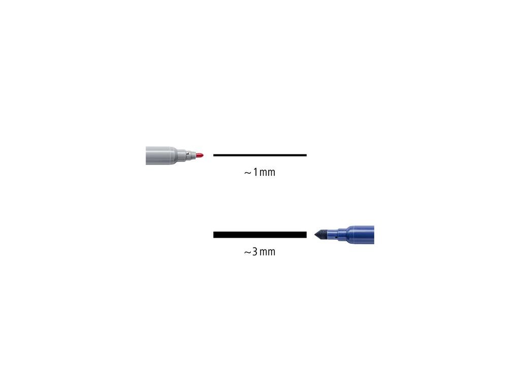 obojstranné fixky pre nakreslenie tenších a hrubších čiar ideálne na kreslenie, písanie, maľovanie živé farby z väčšiny textílií vyprateľné PP telo pera hrúbka písma: 1 mm a 3 mm 20 rôznych farieb Značka: STAEDTLER Výrobca: STAEDTLER SE Adresa: Moosäckerstr. 3 , 90427 Nuremberg, Germany Web: http://www.staedtler.com Email: https://www.staedtler.com/intl/en/service/contact/Dodatočné parametre
