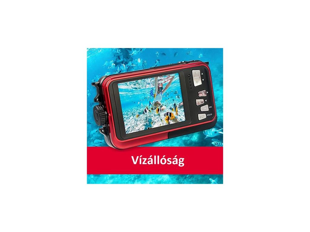 Cenovo dostupný vodotesný fotoaparát, ktorý oceníte na dovolenke. Fotografujte a nahrávajte FullHD video v hĺbke až 3 m! Fotoaparát má 2,7" hlavný displej a 1,8" selfie displej. Medzi ďalšie funkcie zariadenia patrí detekcia tváre a samospúšť. Fotoaparát je napájaný ľahko dobíjateľnou batériou. Na ukladanie dát sú podporované karty micro SD s kapacitou až 128 GB. Rozmer: 105 x 65,3 x 24,6 mm - Hmotnosť: 130 gDodatočné parametre