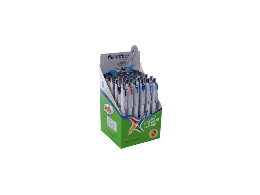 Guľôčkové pero, 0,4 mm, stláčací mechanizmus, rôzne farby tela, FLEXOFFICE "Senior", modré