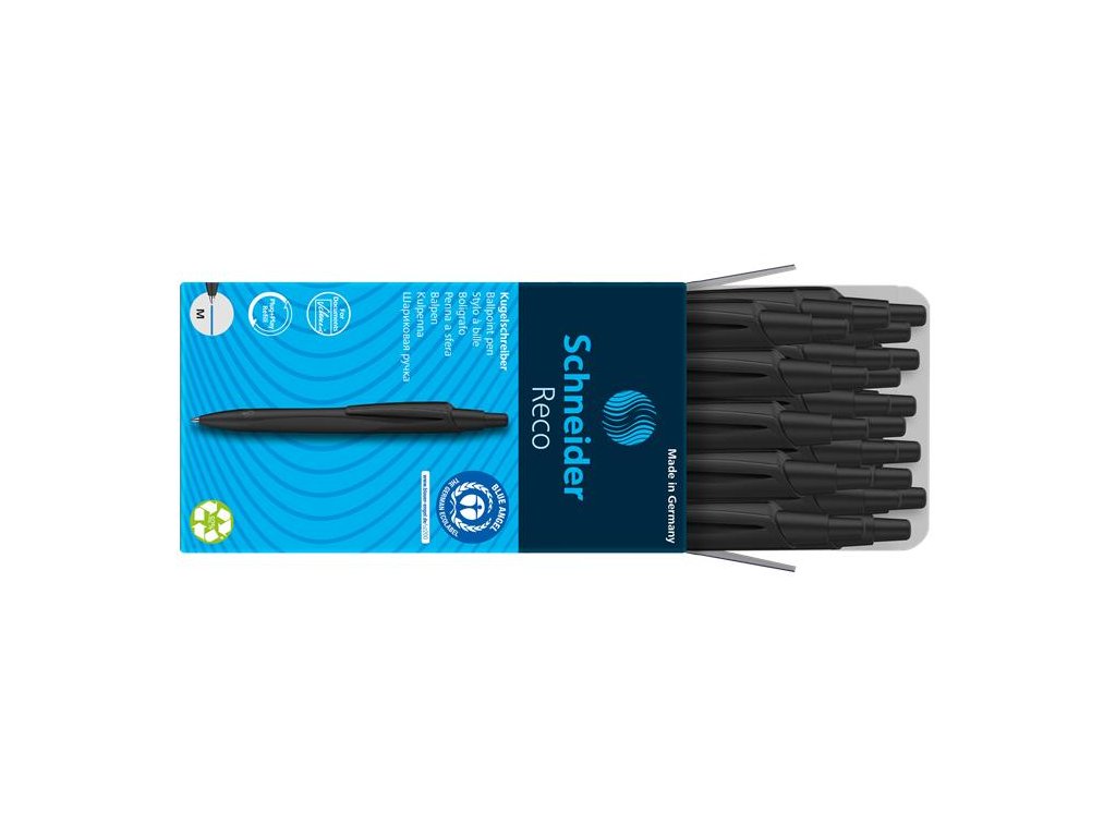 Guľôčkové pero, 0,5 mm, SCHNEIDER "Reco M", čierna, s náplňou 0,5 mm,"Eco 725 M", modrá