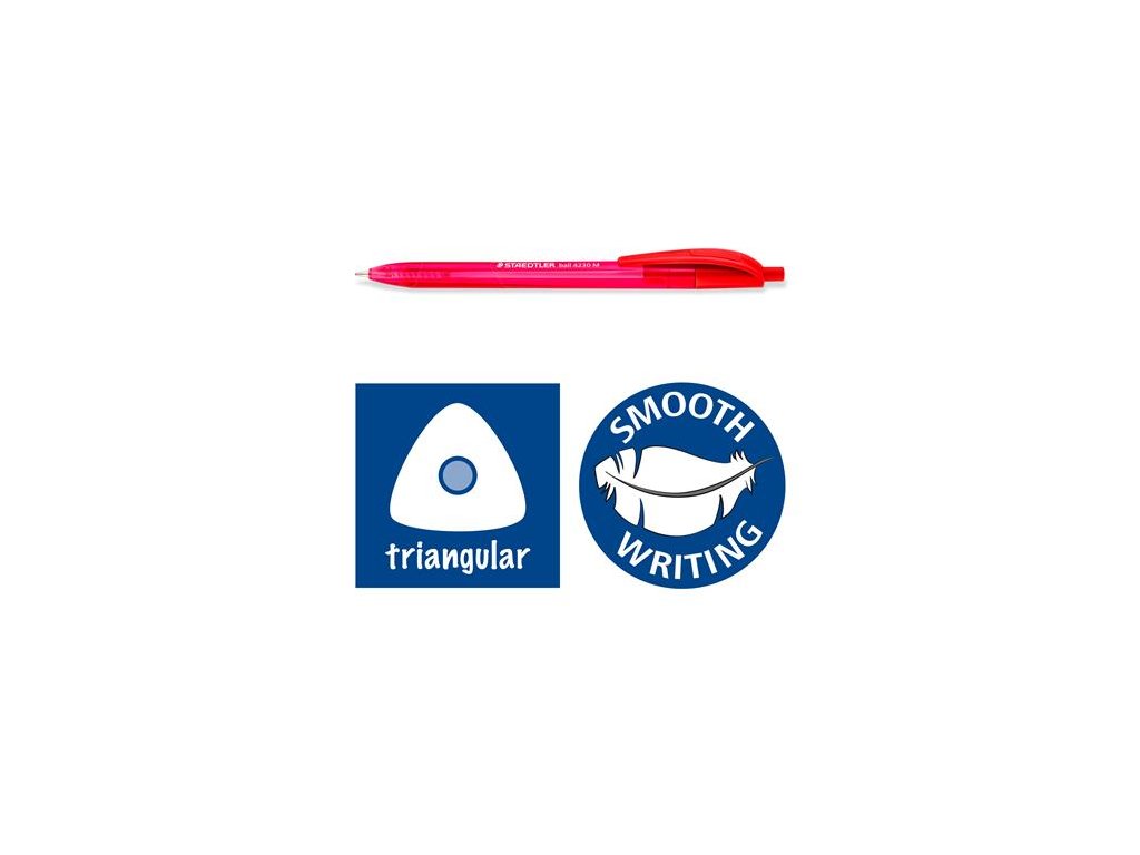 Guľôčkové perá sa stali neodmysliteľnou súčasťou každodenného života. Keďže ich atrament pozostáva zo zmesi tuku a oleja, guľôčkové perá nevysychajú a dlho vydržia. Sú preto ideálne pre každodenný kancelársky život a na zaznamenávanie dôležitých informácií. 4230 M vyčnieva z radu ergonomickým trojhranným tvarom a atraktívnym výberom farieb. - ergonomické telo pera pre ľahké písanie bez únavy - obzvlášť konzistentný výkon pri písaní - hrúbka písma: 0,5 mm - 8 farieb s farbami dúhy: červená, purpurová, fialová, modrá, svetlomodrá, svetlozelená, zelená, čierna Značka: STAEDTLER Výrobca: STAEDTLER SE Adresa: Moosäckerstr. 3 , 90427 Nuremberg, Germany Web: http://www.staedtler.com Email: https://www.staedtler.com/intl/en/service/contact/Dodatočné parametre