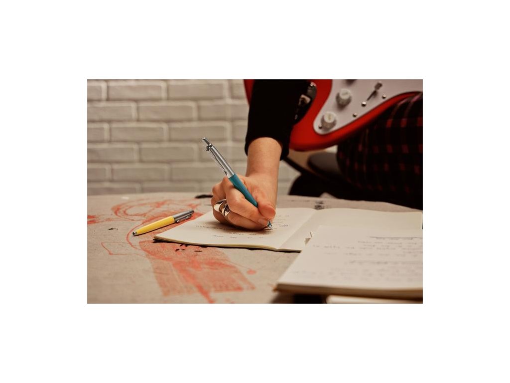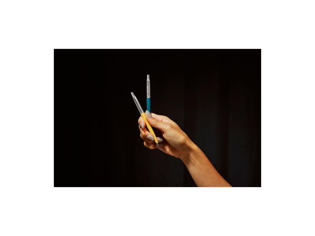 Guľôčkové pero, sada, 0,7 mm, strieborný klip, žlté a modré telo pera, PARKER "Jotter Glam Rock", modré