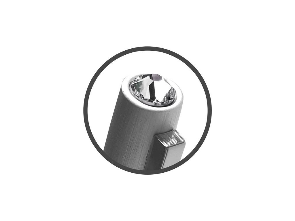 - guľôčkové pero s moderným dizajnom, ozdobené s originálnym krištáľom SWAROVSKI® - elegantné, trendové vyhotovenie - kovové telo pera je gravírovateľná - farba tela: strieborná - farba krištáľu: biela - farba náplne: modrá - hrúbka písma: 0,7mm - v čiernej zamatovej krabičkeDodatočné parametre