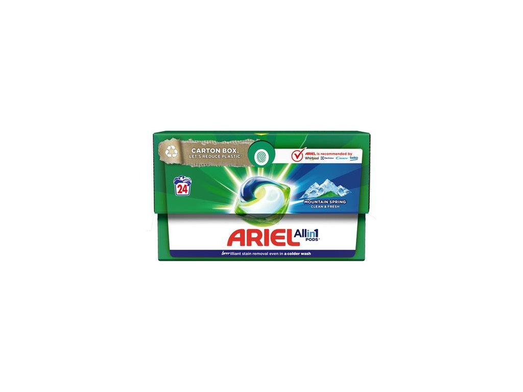 Ariel Allin1 poskytuje mimoriadny čistiaci účinok, zlisovaný len do jednej malej kapsuly. Špeciálny, viackomorový dizajn kapsúl na pranie Ariel Allin1 PODS Mountain Spring stabilne a oddelene uchováva aktívne zložky až do začiatku prania, čím poskytuje superkoncentrovaný čistiaci účinok. - odstraňuje škvrny - dodáva šatám lesk - osviežuje textílie - chráni tkanivá - vhodné aj na pranie v studenej vode - vo vode rozpustná filmová vrstva - jednoduché použitie: nie je potrebné merať a plniťDodatočné parametre