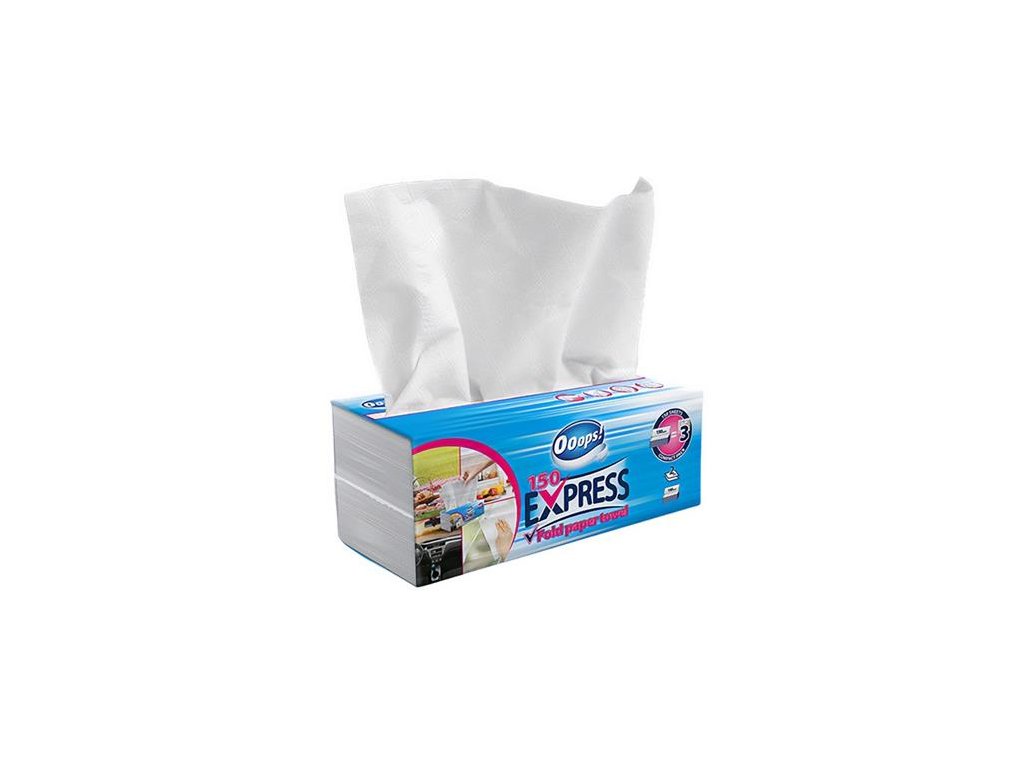 Ooops! Express 150 skladané papierové utierky sú ideálnou voľbou na akékoľvek použitie – do domácnosti, na cestovanie, na vonkajšie aktivity alebo pri starostlivosti o auto. Vďaka technológii V-ohybu sa po vytiahnutí jednej utierky automaticky objaví ďalšia, pripravená na použitie. Tým sa znižuje plytvanie, pretože sa spotrebuje len potrebné množstvo papiera. Vodoodolné balenie chráni utierky pred znečistením počas celého používania.praktické balenie s jednoduchým dávkovaním -vodoodolné balenie -2-vrstvové -150 útržkov/balenie -rozmery útržku: 210 x 250 mm -farba: biela -materiál: FSC celulóza -20 balení/kartón, 320 balení/paleta