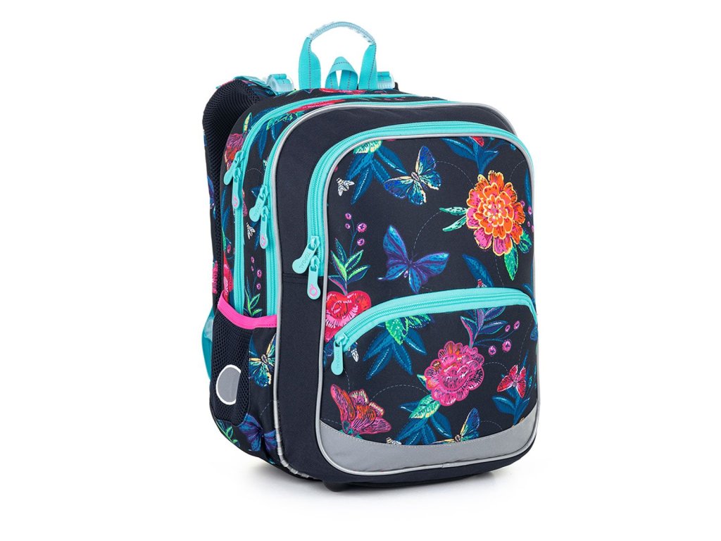 BAZI je nový strih tašky, ktorý sme uviedli na trh v roku 2021 a osvedčil sa! Preto sme ho tento rok vyzdobili motýľmi a kvetmi na tmavomodrom pozadí. Ľahká dvojkomorová taška BAZI dobre padne všetkým dievčatám na prvom stupni základnej školy. Do jej dvoch priehradiek a dvoch predných vreciek sa zmestí všetko učivo minimálne prvých troch ročníkov základnej školy. Páči sa vám?