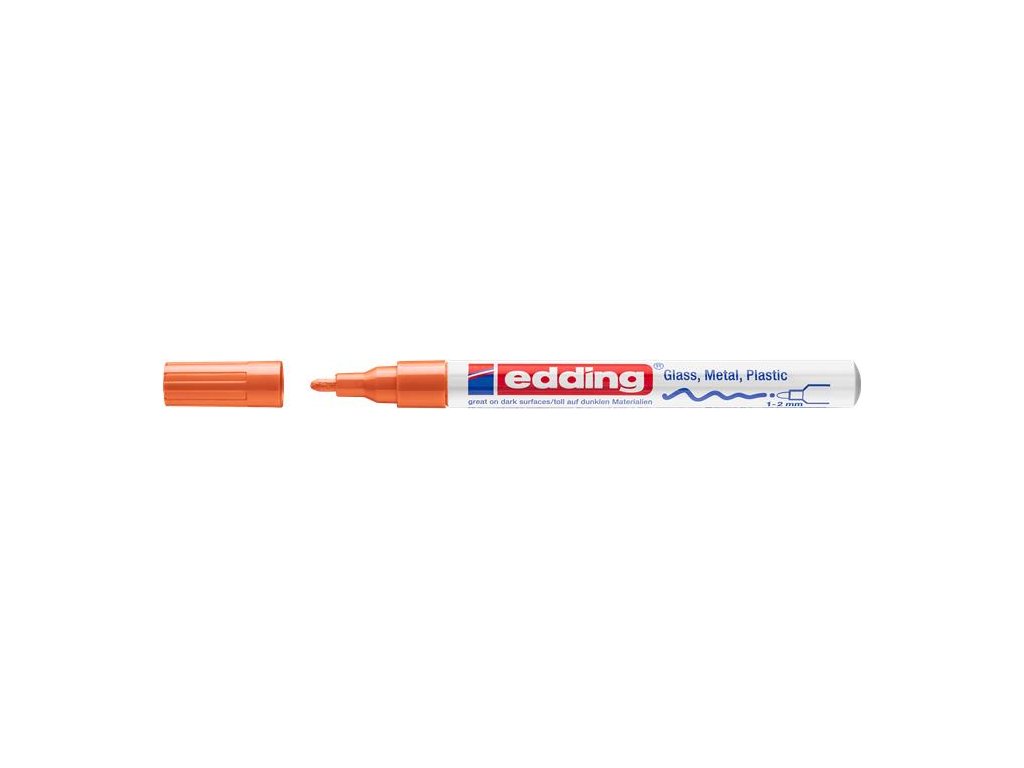 vhodný takmer na všetky povrchy (sklo, kov, porcelán, plast) zaoblený hrot kovové telo vode a svetlu odolný, nezotierateľný rýchloschnúci atrament vhodné aj na zašpinené povrchy rovnomerné dávkovanie atramentu farba uzáveru sa zhoduje s farbou náplne hrúbka písma: 1–2 mm Značka: EDDING Výrobca: EDDING INTERNATIONAL GMBH Adresa: Bookkoppel 7, 22926 Ahrensburg, Germany Web: www.edding.com Email: info@edding.comDodatočné parametre