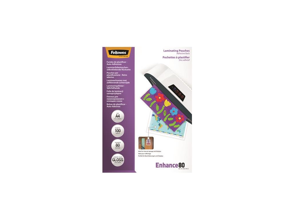 Laminovacia fólia, 80 mikr., A4, lesklá, samolepiaca, 100 ks, FELLOWES