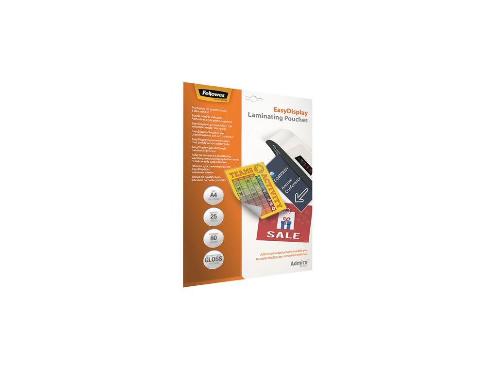 Laminovacia fólia, za tepla, 80 mikr., A4, lesklá, samolepiaca, 25 ks, FELLOWES "Admire Easy Display"
