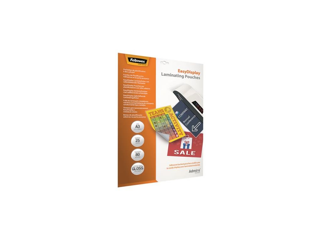 Laminovacia fólia za tepla, 80 mikr., A3, lesklá, samolepiaca, 25 ks, FELLOWES "Admire Easy Display"
