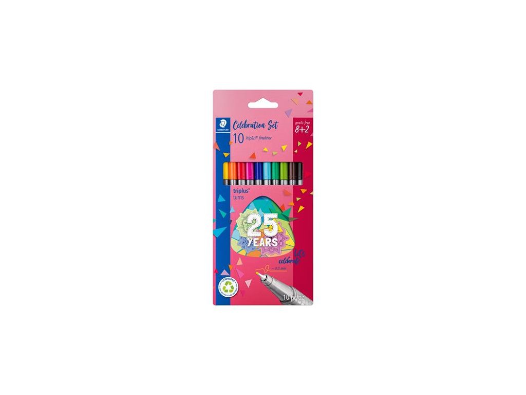 ultra tenký hrot ergonomický trojuholníkový tvar pre hladké a pohodlné písanie stabilný kovový hrot "Dry Safe" - bez uzáveru nevyschne niekoľko dní (okrem neónových farieb) atrament na vodnej báze z väčšiny textílií vyprateľné PP telo pera hrúbka písma: 0,3 mm Mix & Match funkcia: kombinovateľné s modelom 323 sada obsahuje 10 rôznych farieb Značka: STAEDTLER Výrobca: STAEDTLER SE Adresa: Moosäckerstr. 3 , 90427 Nuremberg, Germany Web: http://www.staedtler.com Email: https://www.staedtler.com/intl/en/service/contact/Dodatočné parametre