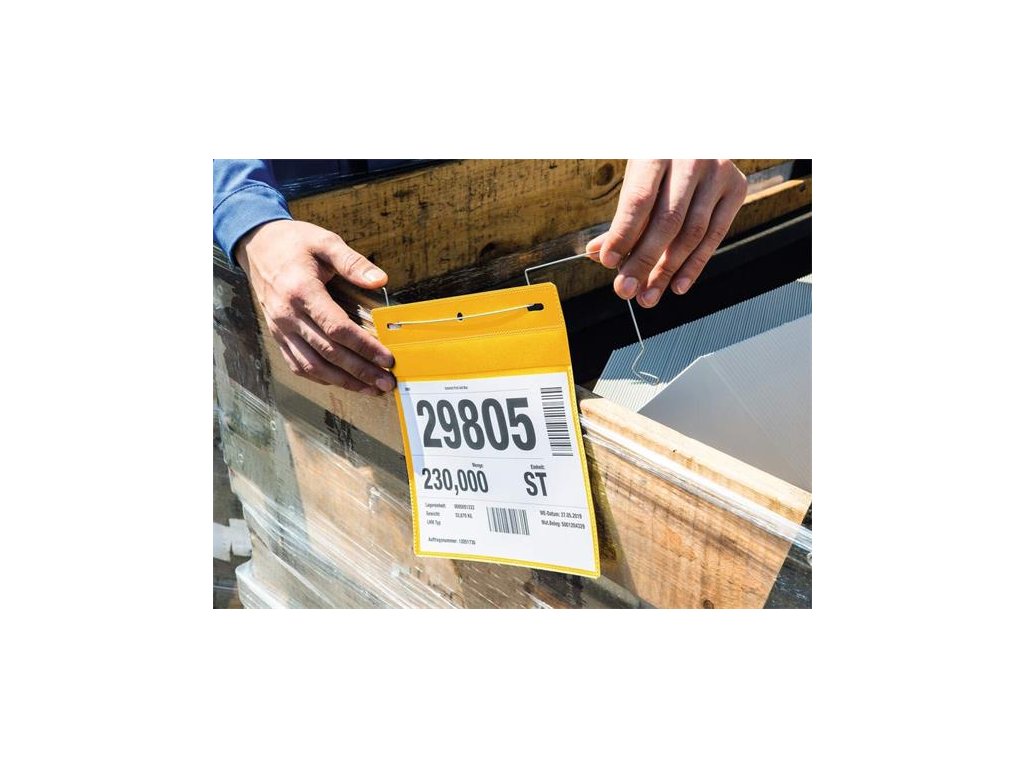 Žltá zadná strana a priehľadná predná strana. Možnosť skenovania, ochrana vložených dokumentov. Jednoduchá a rýchla výmena vložených listov. Uchytenie: Pomocou galvanizovaného drôtu.