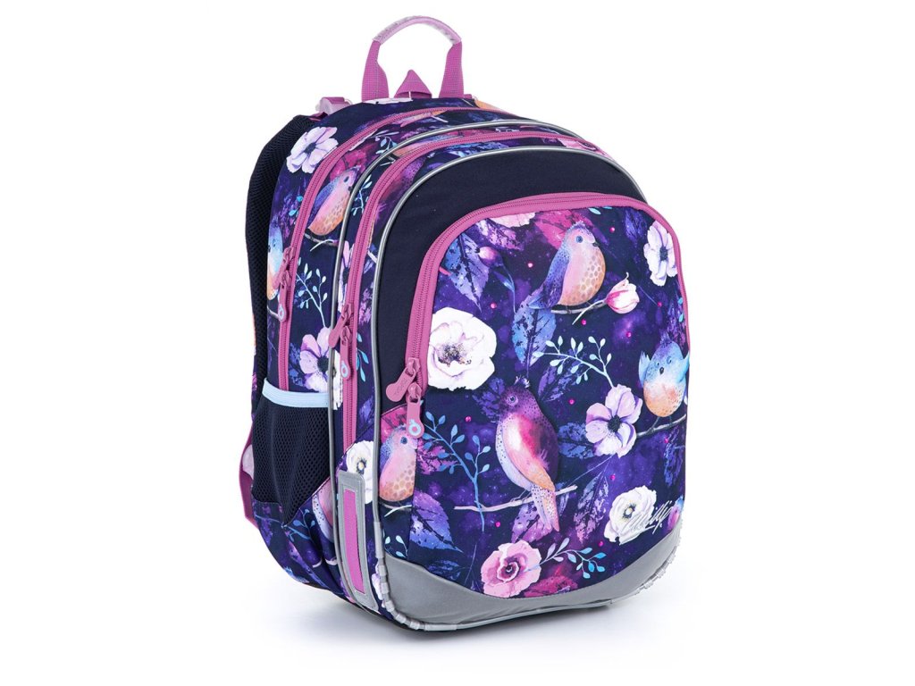 Ľahučká dvojkomorová taška pre dievčatá na prvom stupni s motívom vtáčikov, kvietkov a s fialovými trblietkami. To je parádná kombinácia pre školáčky na prvom stupni ZŠ. Navyše neváži ani kilogram a zhĺtne veľa nákladu!