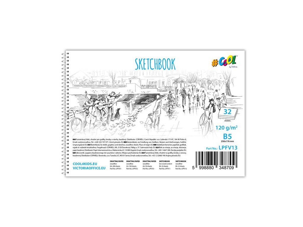 vhodné na grafiky, kresby a osnovy bezdrevný formát: B5: 250mm x 176mm 32 listový čistý 120g/m2 Značka: COOL BY VICTORIA Výrobca: Corwell Kft Adresa: 2120 Dunakeszi, Pallag utca 37. Hungary Web: https://victoriaoffice.eu/termekek/cool-by-victoria Email: cool@cool4kids.euDodatočné parametre