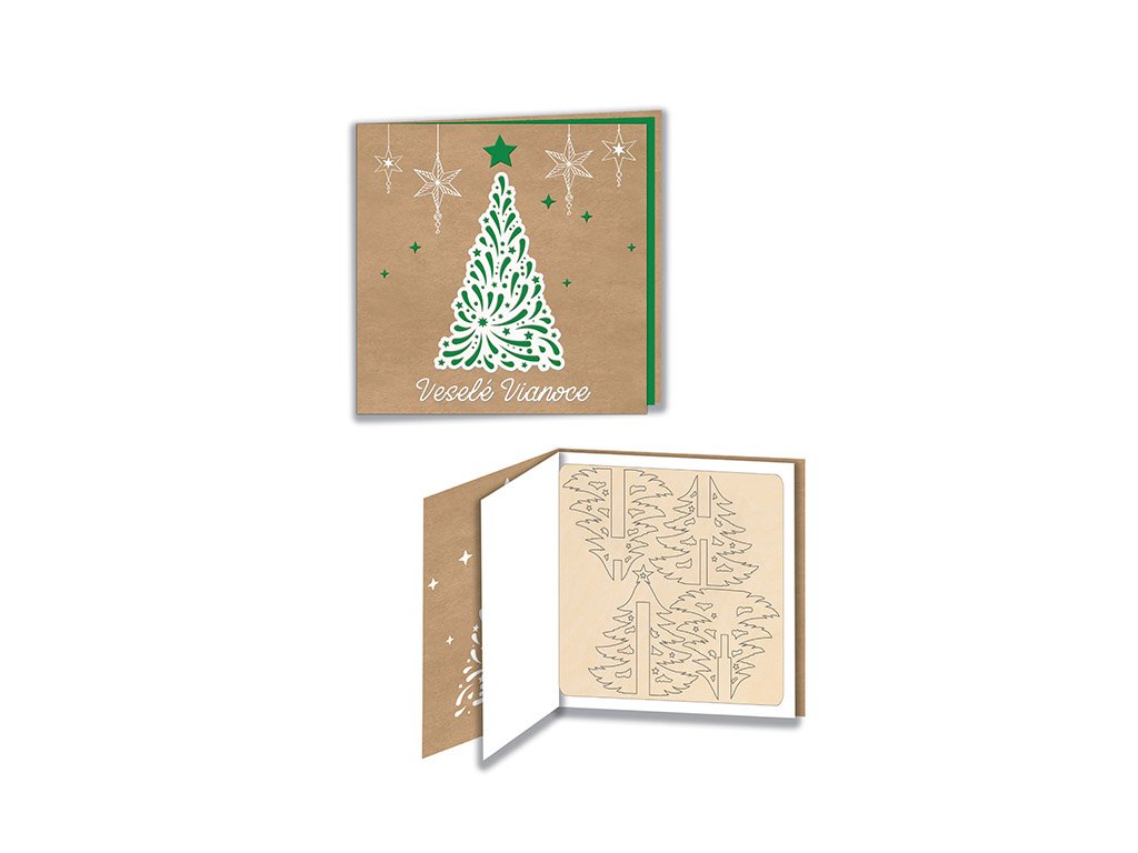 Novoročný pozdrav na grafickom papieri, biela potlač, vypaľovanie laserom, vnútorný papier jednostranne potlačený zelenný, drevená dekorácia na preglejke. Dodávané spolu s obálkou.Dodatočné parametre