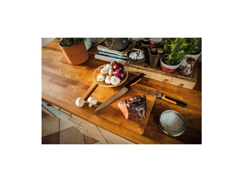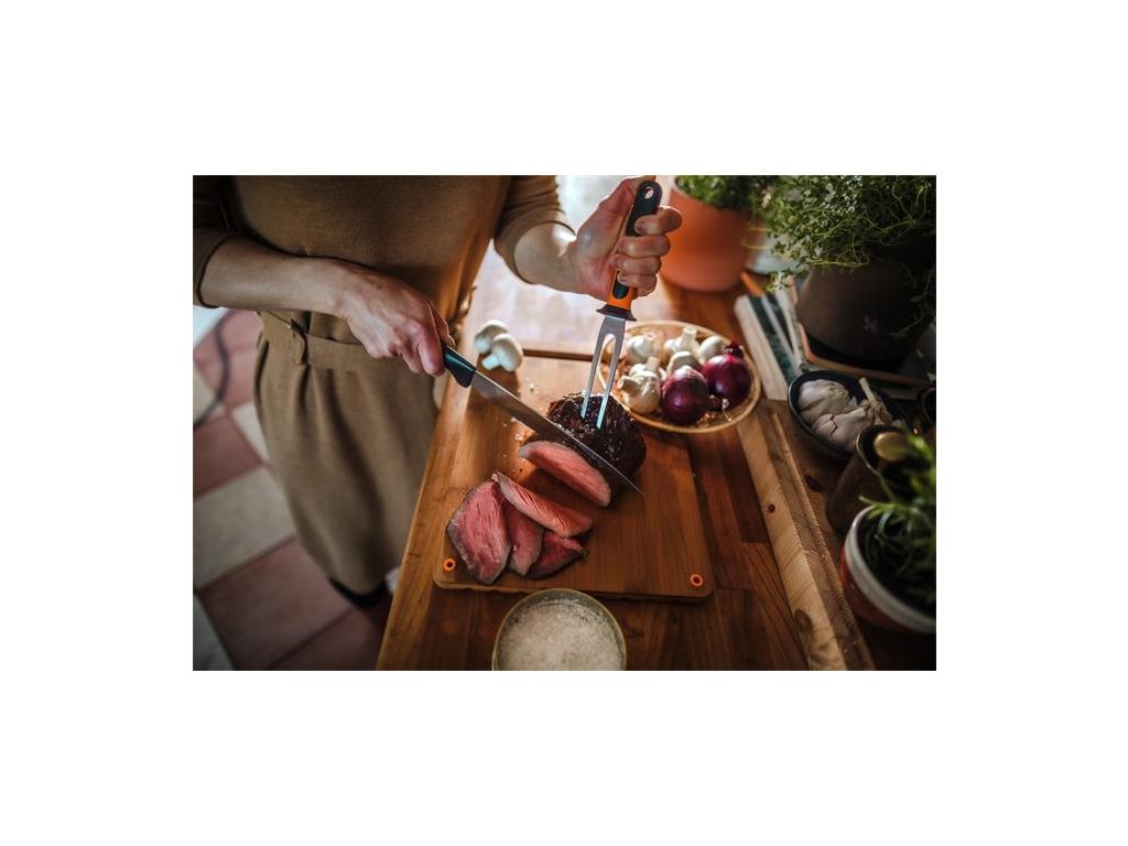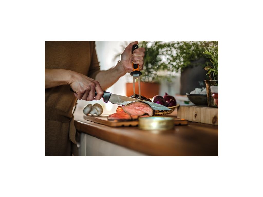 Nôž na porciovanie Fiskars Functional Form ™ má dlhú čepeľ s jemným ostrím a je navrhnutý na pohodlné používanie a ľahkú údržbu Ideálny na krájanie mäsa na plátky Odolná čepeľ z japonskej nehrdzavejúcej ocele Ergonomická rukoväť s povrchom SoftGrip ™ v mieste uchopenia Hlboký chránič prstov zabezpečuje pohodlné a bezpečné držanie Možno umývať v umývačke riadu Dĺžka čepele 210 mm Tvrdosť čepele HRC 52 Vysoký rezací výkon (testované podľa metodiky CATRA) Navrhnuté vo FínskuDodatočné parametre