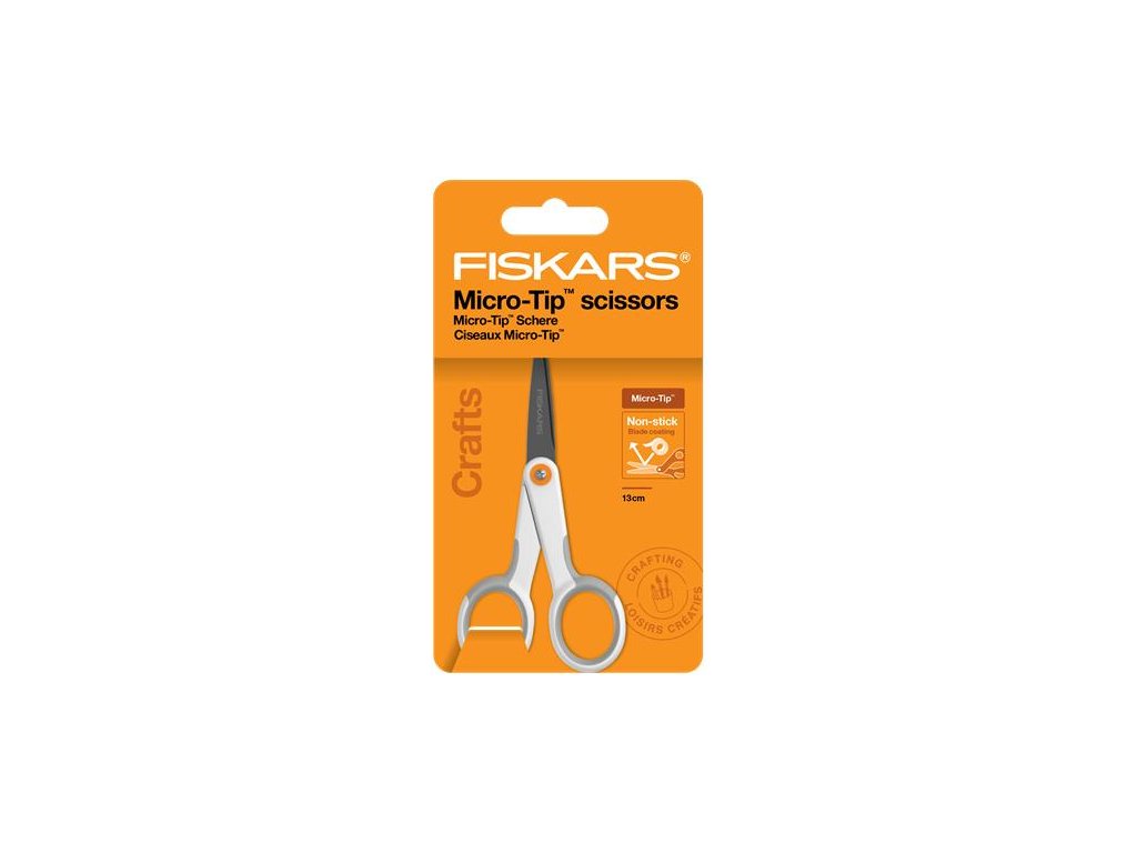 Nožnice s nepriľnavým povrchom Fiskars Micro-Tip™ umožňujú presné a čisté rezy lepkavých materiálov pre tvorenie, ako sú lepiace pásky, vinyly a samolepkyVysokokvalitné, precízne brúsené čepele z nehrdzavejúcej ocele zostávajú dlho ostré