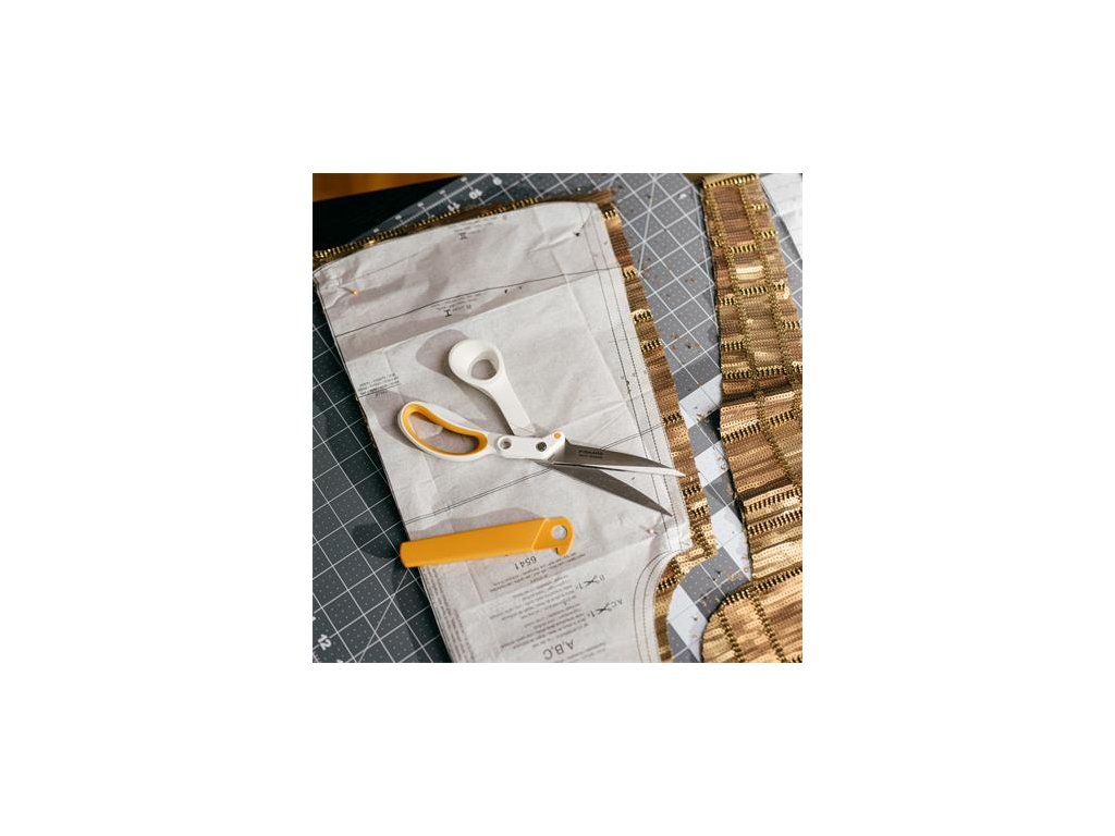 - Nožnice na látky Fiskars Amplify™ umožňujú presné a čisté rezy viacerých vrstiev látok alebo hrubých tkanín, ako je koža, čalúnenie, vinyl, vrecovina, semiš, flanel a ďalšie