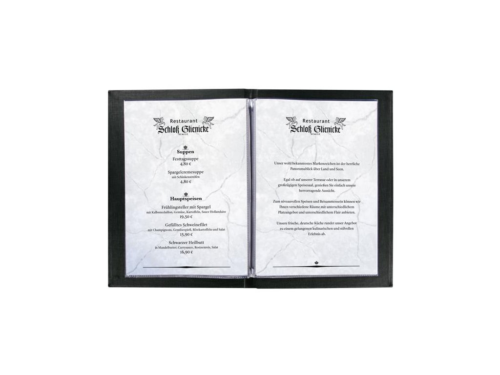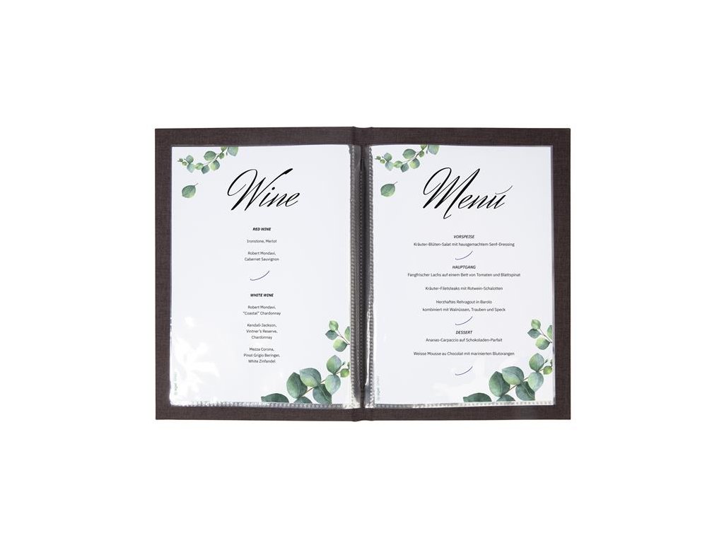 Kvalitný obal na jedálny lístok, ktorý nikdy nevyjde z módy. -formát A4 -rozmery: 210 x 297 mm -medzinárodný nápis na obálke: „Menu“ -dokumenty sa dajú ľahko vkladať a vymieňať -viazanie pomocou gumičky -ľahko sa čistí -odolný PU materiál -materiál odolný voči oderu a poškriabaniu -obsahuje 2 priehľadné puzdrá – na 8 strán (ďalšie náhradné puzdrá dostupné pod číslom produktu SISM180)Značka: SIGEL