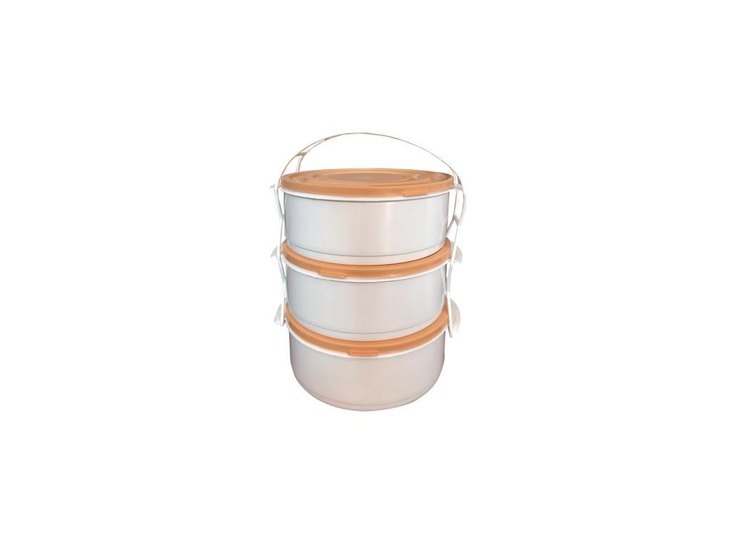 Trojdielny plastový obedár na potraviny s rôznofarebnými vekami a praktickou rukoväťou, ktorý drží tri časti pohromade počas prepravy a zdvíhania. Môžete ho vložiť do mikrovlnnej rúry alebo chladničky. Počas používania dávajte pozor, aby sa neprevrátil, držte 3 podperné boxy zvisle nad sebou. Čistenie čistiacim prostriedkom, ktorý nepoškriabe, chráňte pred sálavým teplom. materiál: plast 3 priehradky veko rôznych fariebDodatočné parametre