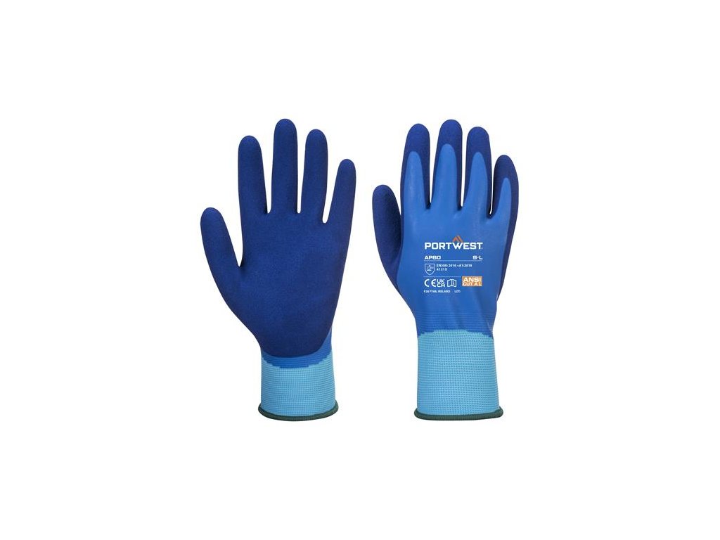 Ochranné rukavice, latexové, latexová pena, máčaná dlaň, veľ. M, "Liquid Pro", modrá