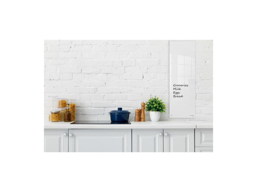 Odkazová tabuľa, sklenená, nástenná, úzka, 30x90 cm, NOBO "Home", biela
