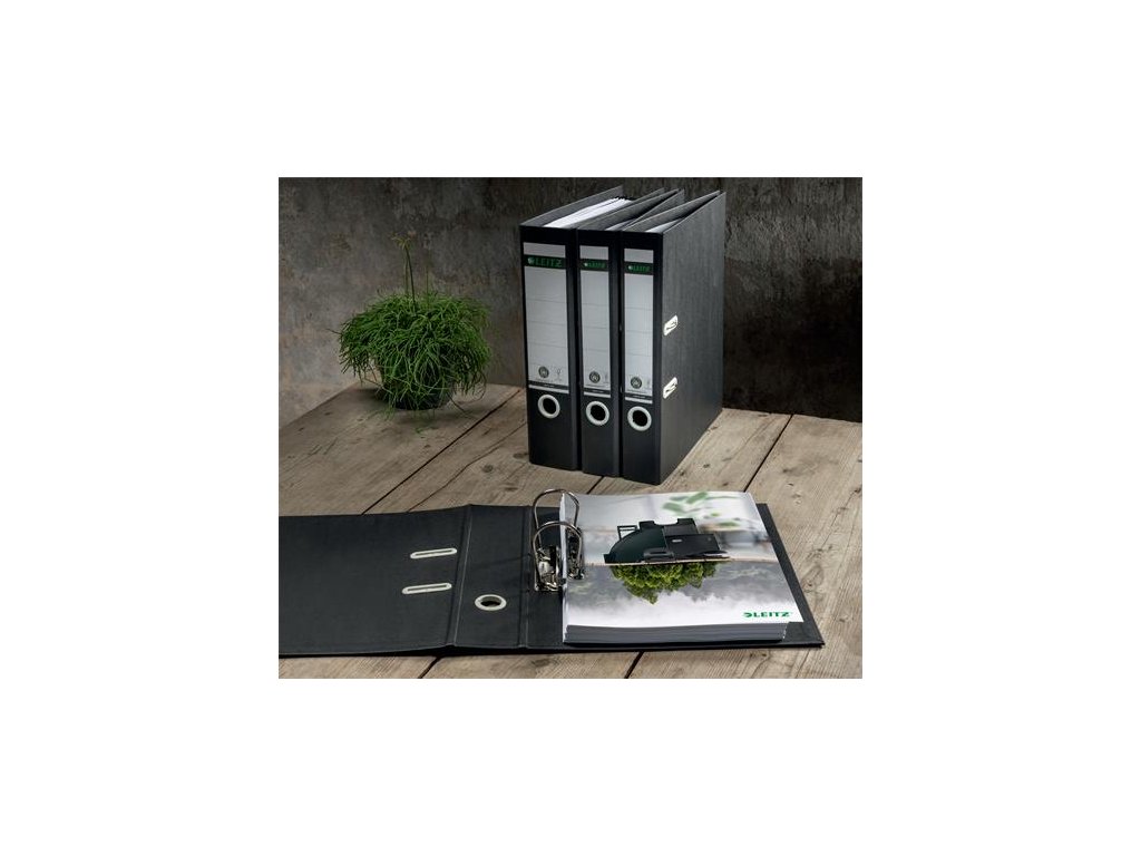 Atraktívny, pákový šanón na dokumenty prémiovej kvality vyrobený z recyklovaných materiálov, ktoré možno rozobrať na úplnú recykláciu - Vyrobené zo 100% recyklovaného kartónu - 100% recyklovateľný, klimaticky neutrálny produkt s certifikátmi Blue Angel a FSC - patentom chránená 180° štruktúra páky, ktorá sa otvára o 50% širšie a výsledkom je až o 20% rýchlejšia organizácia - pevný, papierom potiahnutý šanón na dokumenty v štýlovej čiernej farbe - svetlosivý, vyťahovací otvor z recyklovaného plastu pre jednoduché použitie a rado krúžky - pre stabilitu - kapacita 600 listov A4 (80 g). - 5-ročná záruka na konštrukciu - Produkt vyrobený v Európe Značka: LEITZ Výrobca: Esselte Kft. Adresa: 1139 Budapest, Lomb u. 37-39. A ép. II. 8., Hungary Web: https://www.accobrands.com/brands/ Email: hungarymarketing@acco.comDodatočné parametre