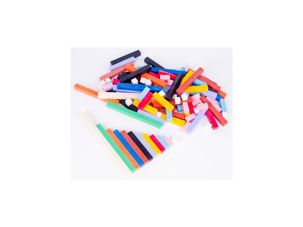 Sada pomôcok obsahuje 120 ks: 25ks biela kocka (1cm) 20ks ružová koca (20cm) 16ks svetlomodrá palička (3cm) 12ks červená palička (4cm) 10ks žltá palička (5dcm) 9ks filaová palička (6cm) 8ks čierna palička (7cm) 7ks hnedá palička (8cm) 5ks tmavomodrá palička (9cm) 4ks oranžová palička (10cm) 2ks zelená palička (12cm) 2ks béžová palička (16cm) Materiál: plastDodatočné parametre