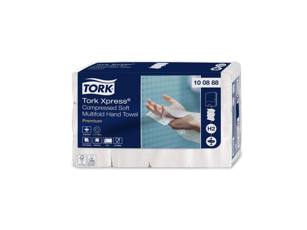 Papierové utierky, stlačené, Interfold, 2-vrstvové, 170 útržkov, H2 systém, Premium, TORK "Xpress Soft Multifold", biela