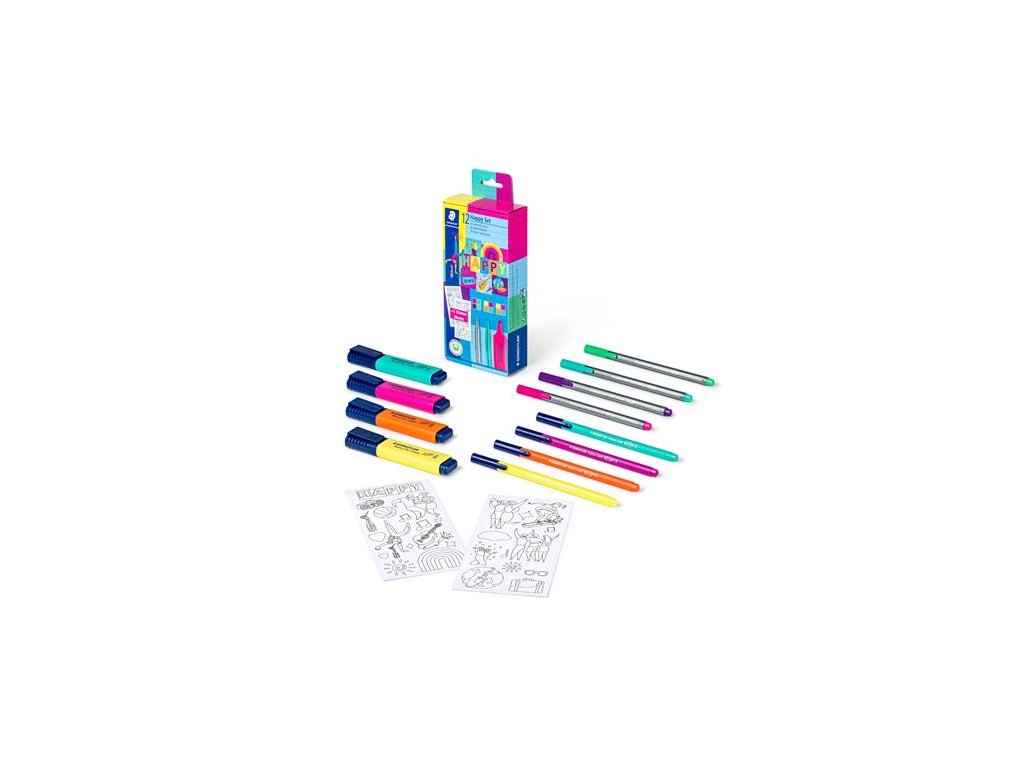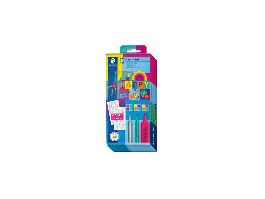nový rad výrobkov STAEDTLER "Happy" s atmosférou šťastia hlavným posolstvom tohto produktového radu je, že nás čaká krajšia buducnosť sada obsahuje: 4x zvýrazňovače 4x fixky 4x linery darček: vyfarbiteľné nálepkyDodatočné parametre
